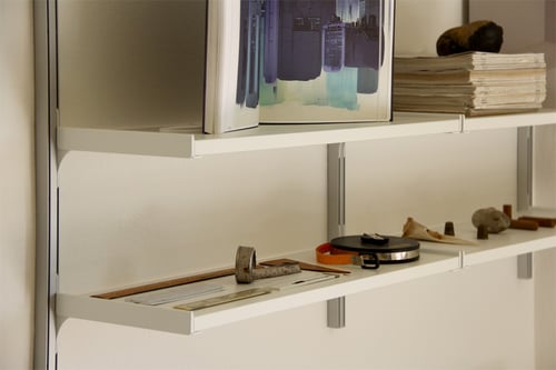 This system is designed to be visually light and linear, in order to make the items placed on the shelves the focal point for the observer and therefore make it suitable for any environment and space, with the idea that the less accentuated the visual impact of an object is, the easier it is to merge it with our spaces and accept it as a part of our lives.